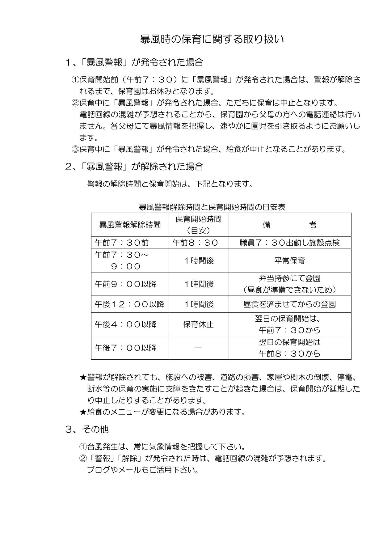 - 施設および地域への災害(事故)発生時は、必要に応じて保育(開所)時間、保育内容、食事有無およびメニューを変更の上で保育を行います。但し、施設被害により危険な場合や、上水道の停止など保育の継続が不可能な場合は保育を中止致します。