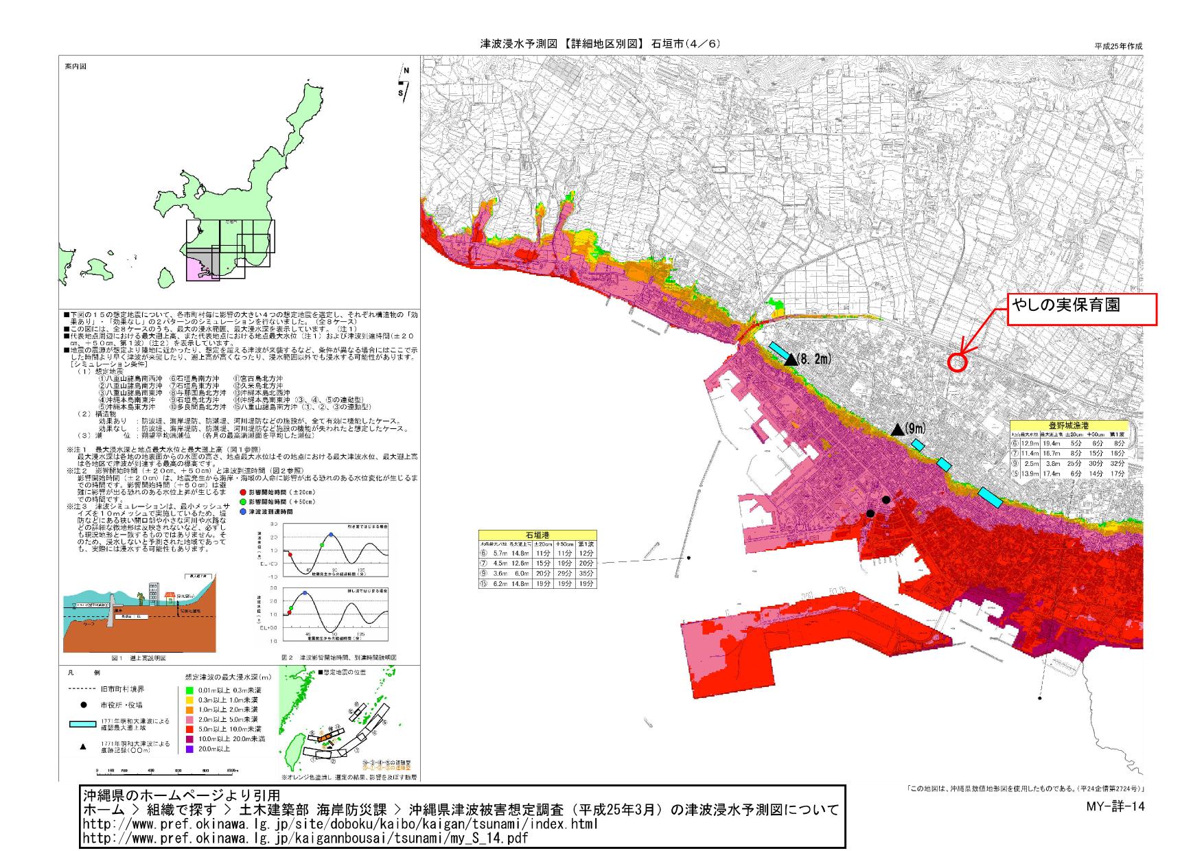 防災マップ等の情報によると、当園の場所(海抜14m)は津波の遡上による被害はないと想定されております。(参考 沖縄県・石垣市)その上で、津波の危険が予想される場合は園舎2階への避難を第一避難先として考えております。